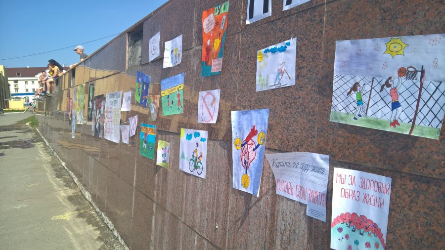 На стене возле администрации города развернули настоящую пропагандистскую выставку. Здесь разместили многочисленные плакаты и рисунки ребят с призывами отказаться от вредных привычек, сигарет, алкоголя и наркотиков. Плакаты были и угрожающие, жутковатые — о скорой смерти от наркоты, и позитивные — о пользе спорта и здорового образа жизни. Все — яркие, интересные, креативные. Такие вполне можно печатать на пачках сигарет и этикетках энергетиков с пивом — глядишь, кто-то и задумается, вспомнит о вреде табака и алкоголя.