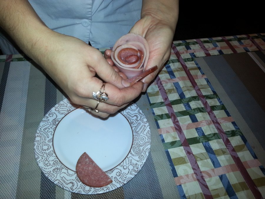 - Разрезаем тонкие кружочки колбасы пополам. Первый ломтик сворачиваем тугим рулетиком, в дальнейшем каждый последующий сворачиваем вокруг предыдущего.